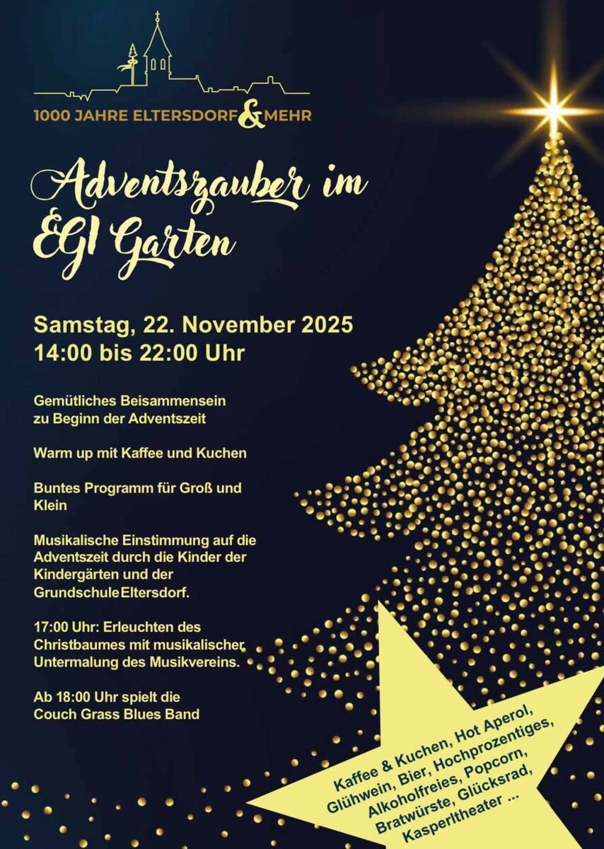 Aktuelles 22.11.2025 Event vom: 22.11.2025 | Eventbeginn: Samstag, 22.11.2025, 14:00–22:00 Adventszauber im EGI Garten Veranstalter: 1000+ Ort: EGi-Garten (Eltersdorfer Straße 19-21, 91058 Erlangen-Eltersdorf)