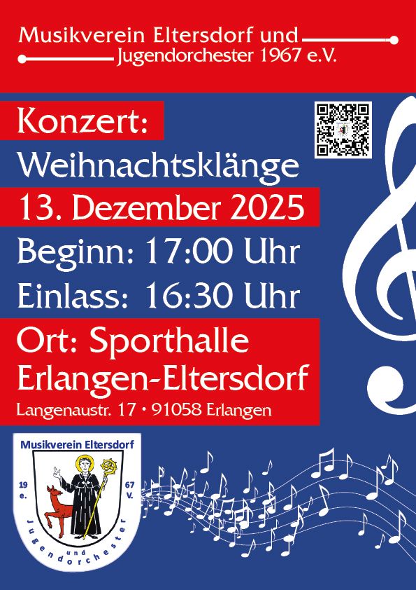 Aktuelles 13.12.2025 Event vom: 13.12.2025 | Eventbeginn: Samstag, 13.12.2025, 16:30 Weihnachtsklänge MVE Veranstalter: MVE Ort: Sporthalle SCE (Langenaustraße 17, 91058 Erlangen-Eltersdorf)
